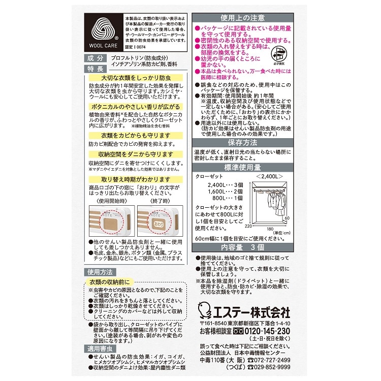 ※本品を除湿剤(ドライペット)と一緒に使用すると、防虫・防カビ・除湿の効果で、大切な衣類を守ります。