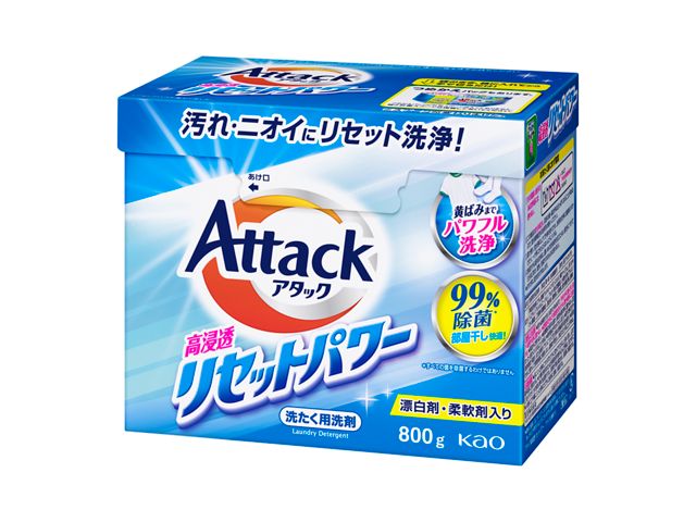 界面活性剤〔21%、直鎖アルキルベンゼンスルホン酸ナトリウム、ポリオキシエチレンアルキルエーテル、〕、アルカリ剤(炭酸塩)、水軟化剤(アルミノけい酸塩)、、工程剤(硫酸塩)、漂白剤、柔軟剤、蛍光増白剤、酵素