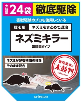 蓄積毒の殺そ剤です。ネズミが好む食物を配合した粉末タイプで、体表に付着した薬剤を毛づくろいによって効率的に取り込ませることができます。