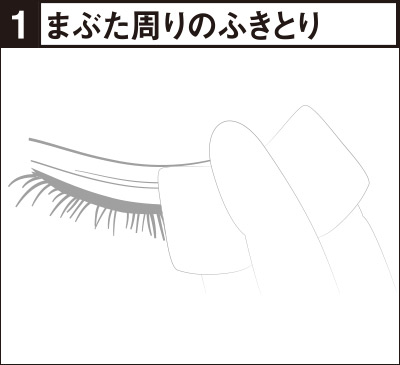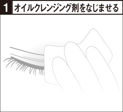 洗顔の際にオイルクレンジング剤を使用し、十分になじませ、 優しくなでるように落としてください。 ※指や爪などで無理やり引っ張って剥がしたり、 強くこすらないでください。肌を傷める原因となります。 Point :手と顔が乾いた状態で、コットンにオイルクレンジング剤をたっぷりと含ませ、しばらくまぶたの上に置いてから 外すようにすると落ちやすくなります。 |