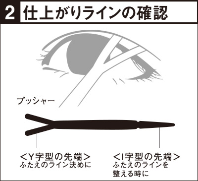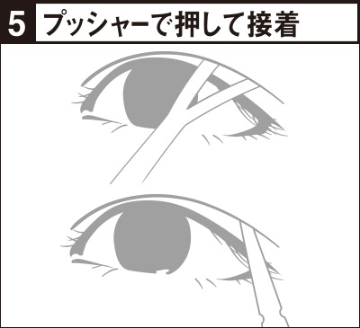 目尻まで塗ったら、付属のプッシャーを使用してまぶたを押し込み、10秒ほどキープした後、プッシャーを外してください。 Point : まぶたの丸みに沿ってプッシャーをしっかりと押し込み、 ラインを崩さないように目尻側から引き抜くと、 綺麗に接着します。二重ラインのガタつきが気になる場合は、 プッシャーのI字型の方で折り込むように整えてください。 |