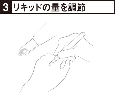 容器の後ろ側にあるボタンを押して先端からリキッドが出たら、 手の甲で一度ならして調整します。 |
