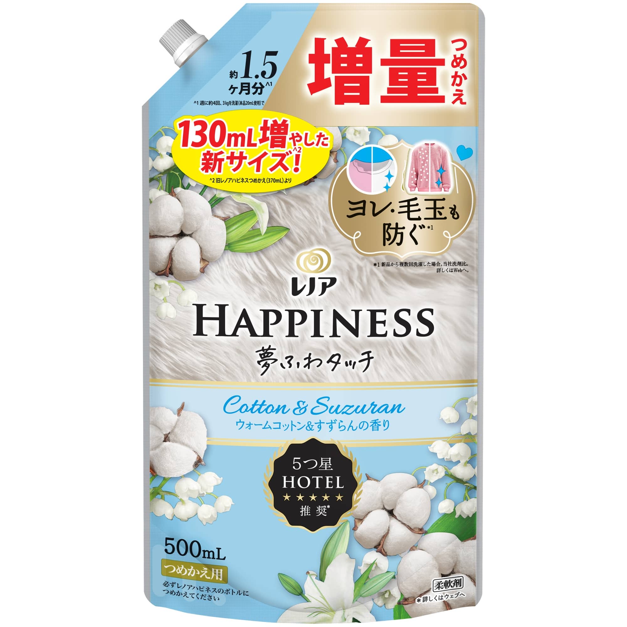 【お取り寄せ】レノアハピネス 夢ふわタッチ ウォームコットン&すずらんの香り つめかえ用 500ml