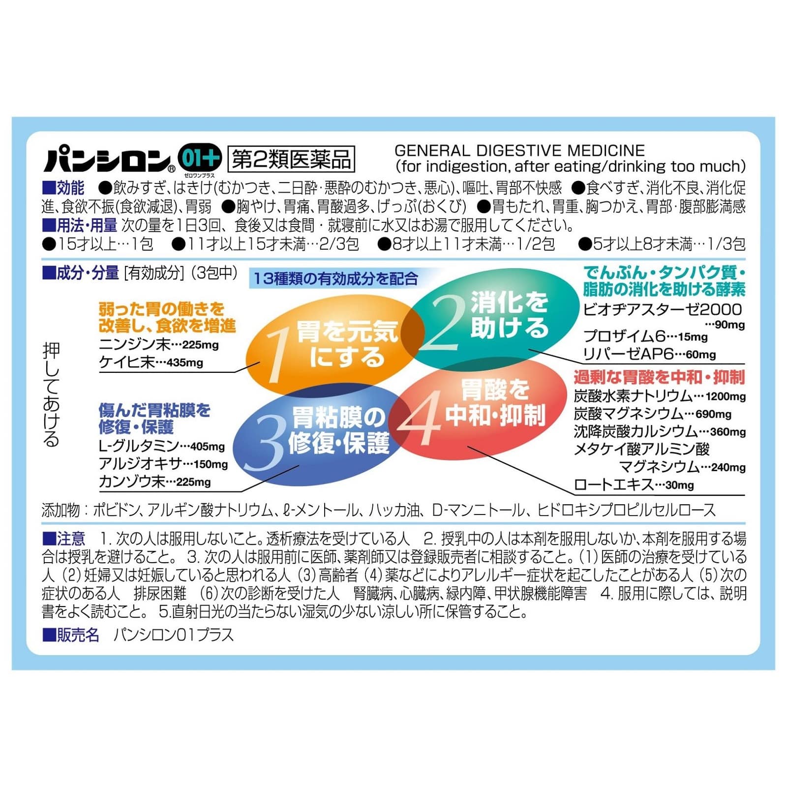 ■「パンシロン01プラス」は、食べすぎ・飲みすぎ・胸やけや、夜遅い食事で胃がもたれるなどの